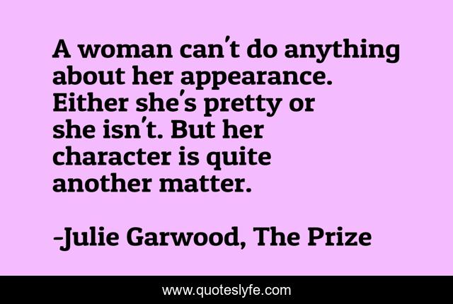 This page presents the quote "A woman can't do anything about her appearance. Either she's pretty or she isn't. But her character is quite another matter.". Author of this quote is Julie Garwood, The Prize. This quote is about enthusiasm, character, beauty, inspirational, women,.
