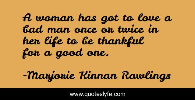 This page presents the quote "A woman has got to love a bad man once or twice in her life to be thankful for a good one.". Author of this quote is Marjorie Kinnan Rawlings. .