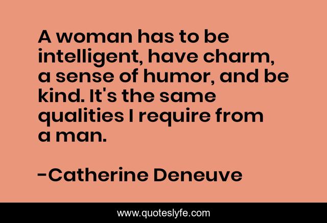 This page presents the quote "A woman has to be intelligent, have charm, a sense of humor, and be kind. It's the same qualities I require from a man.". Author of this quote is Catherine Deneuve. .