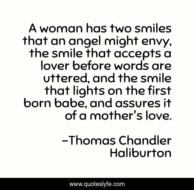 This page presents the quote "A woman has two smiles that an angel might envy, the smile that accepts a lover before words are uttered, and the smile that lights on the first born babe, and assures it of a mother's love.". Author of this quote is Thomas Chandler Haliburton. This quote is about smile, love, affection, happiness, mother,.