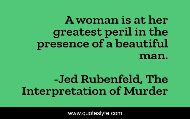 This page presents the quote "A woman is at her greatest peril in the presence of a beautiful man.". Author of this quote is Jed Rubenfeld, The Interpretation of Murder. This quote is about relationships, attraction, love, affection,.