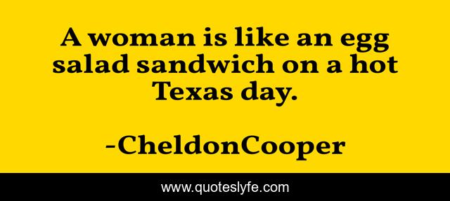 This page presents the quote "A woman is like an egg salad sandwich on a hot Texas day.". Author of this quote is CheldonCooper. This quote is about funny, woman, humor, love, comedy, affection,.
