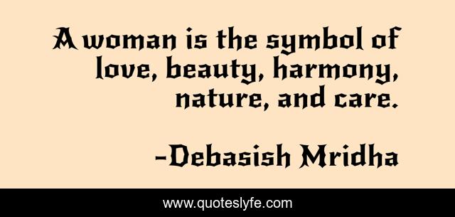 This page presents the quote "A woman is the symbol of love, beauty, harmony, nature, and care.". Author of this quote is Debasish Mridha. This quote is about woman, beauty, philosophy, debasish-mridha, quotes, strength-of-women, harmony, inspirational, enthusiasm,.