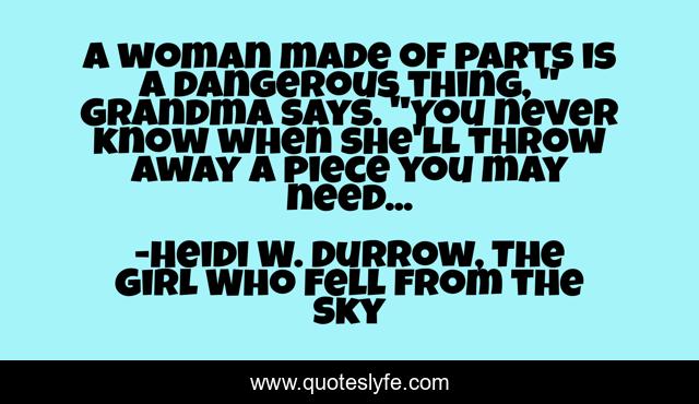 This page presents the quote "A woman made of parts is a dangerous thing, " Grandma says. "You never know when she'll throw away a piece you may need...". Author of this quote is Heidi W. Durrow, The Girl Who Fell from the Sky. This quote is about dangerous-people, expectations, identity, women,.