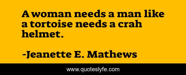 This page presents the quote "A woman needs a man like a tortoise needs a crah helmet.". Author of this quote is Jeanette E. Mathews. This quote is about funny, comedy, humerous,.