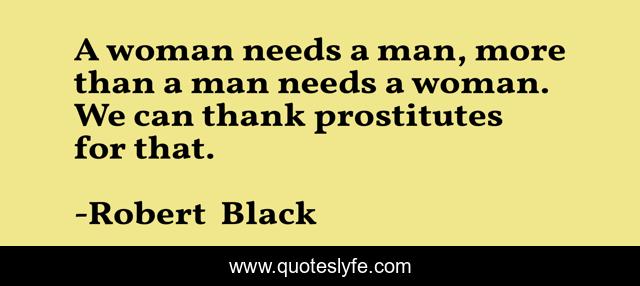 This page presents the quote "A woman needs a man, more than a man needs a woman. We can thank prostitutes for that.". Author of this quote is Robert Black. This quote is about men, prostitutes, women,.