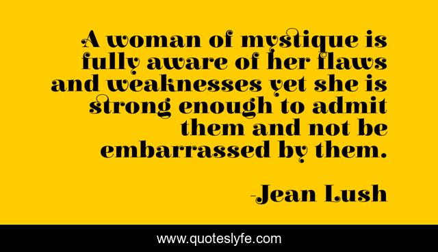 This page presents the quote "A woman of mystique is fully aware of her flaws and weaknesses yet she is strong enough to admit them and not be embarrassed by them.". Author of this quote is Jean Lush. This quote is about self, knowledge,.