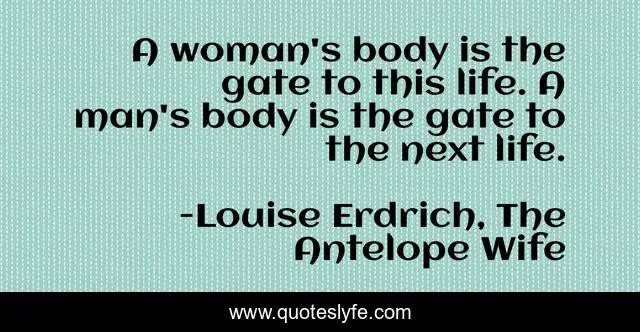 This page presents the quote "A woman's body is the gate to this life. A man's body is the gate to the next life.". Author of this quote is Louise Erdrich, The Antelope Wife. This quote is about otherworld, next-life, underworld, men, women,.
