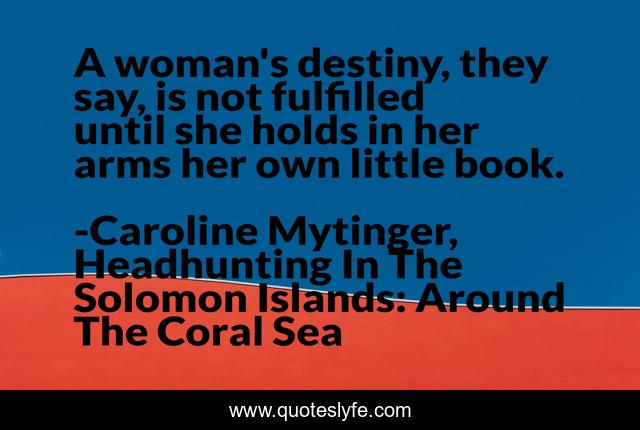 This page presents the quote "A woman's destiny, they say, is not fulfilled until she holds in her arms her own little book.". Author of this quote is Caroline Mytinger, Headhunting In The Solomon Islands: Around The Coral Sea. This quote is about girl, books, destiny, woman, women,.