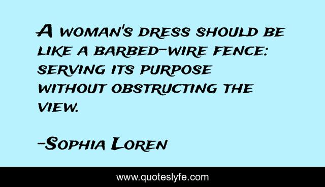 This page presents the quote "A woman's dress should be like a barbed-wire fence: serving its purpose without obstructing the view.". Author of this quote is Sophia Loren. This quote is about simile, fashion, beauty, flirting, woman, dress, women,.