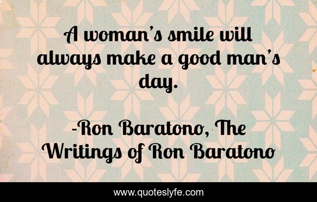 This page presents the quote "A woman’s smile will always make a good man’s day.". Author of this quote is Ron Baratono, The Writings of Ron Baratono. This quote is about smile, woman, day, happiness, man,.