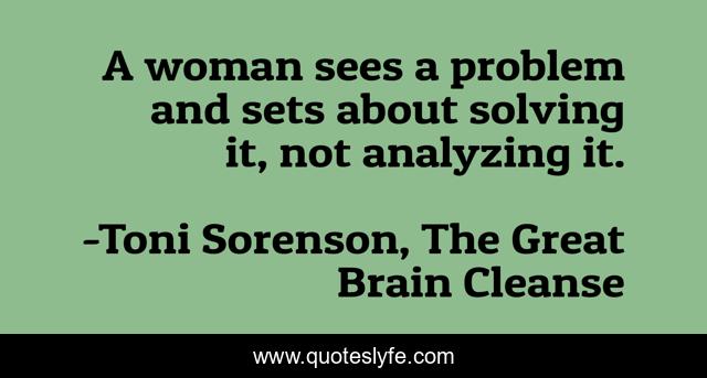 This page presents the quote "A woman sees a problem and sets about solving it, not analyzing it.". Author of this quote is Toni Sorenson, The Great Brain Cleanse. This quote is about problems, women,.