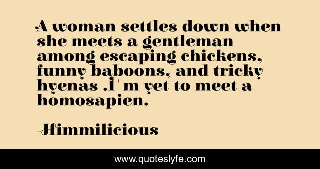 This page presents the quote "A woman settles down when she meets a gentleman among escaping chickens, funny baboons, and tricky hyenas .I'm yet to meet a homosapien.". Author of this quote is Himmilicious. .