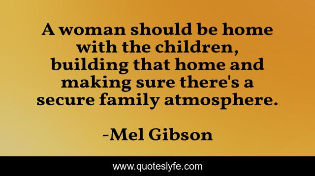 This page presents the quote "A woman should be home with the children, building that home and making sure there's a secure family atmosphere.". Author of this quote is Mel Gibson. This quote is about home, woman, children,.
