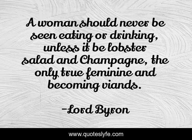 This page presents the quote "A woman should never be seen eating or drinking, unless it be lobster salad and Champagne, the only true feminine and becoming viands.". Author of this quote is Lord Byron. This quote is about eating, woman, true,.