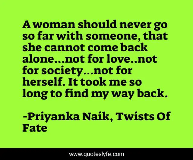 This page presents the quote "A woman should never go so far with someone, that she cannot come back alone...not for love..not for society…not for herself. It took me so long to find my way back.". Author of this quote is Priyanka Naik, Twists Of Fate. This quote is about lessons-learned, love, reflection, affection, women,.