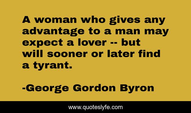 This page presents the quote "A woman who gives any advantage to a man may expect a lover -- but will sooner or later find a tyrant.". Author of this quote is George Gordon Byron. This quote is about relationships, love, men, affection, tyrant, feminism, women,.