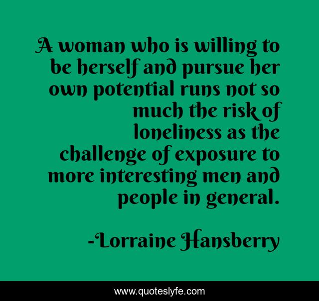 This page presents the quote "A woman who is willing to be herself and pursue her own potential runs not so much the risk of loneliness as the challenge of exposure to more interesting men and people in general.". Author of this quote is Lorraine Hansberry. This quote is about loneliness, talent, women,.