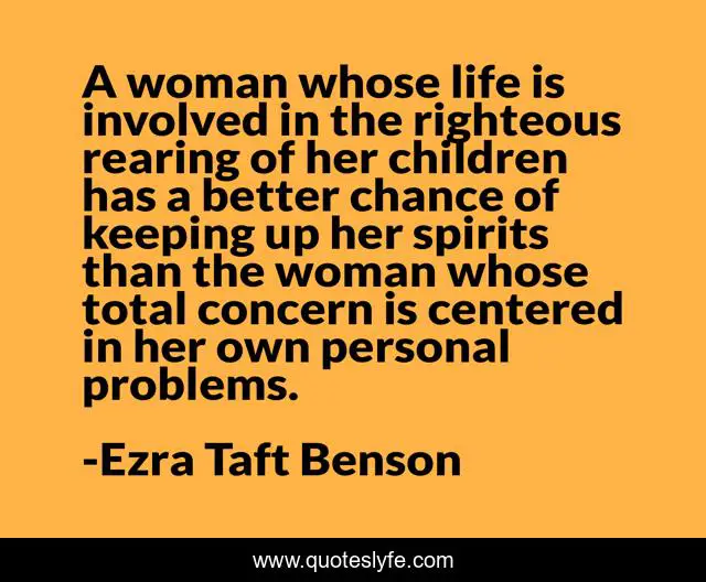 This page presents the quote "A woman whose life is involved in the righteous rearing of her children has a better chance of keeping up her spirits than the woman whose total concern is centered in her own personal problems.". Author of this quote is Ezra Taft Benson. This quote is about life, woman, children,.