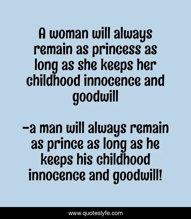This page presents the quote "A woman will always remain as princess as long as she keeps her childhood innocence and goodwill". Author of this quote is a man will always remain as prince as long as he keeps his childhood innocence and goodwill!. .