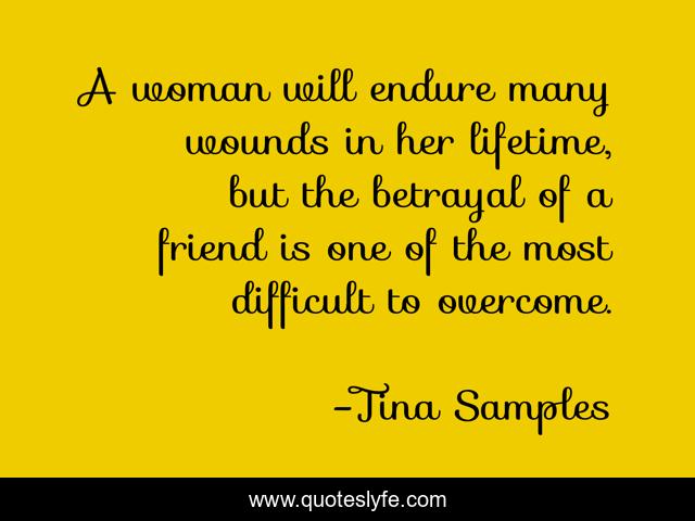 This page presents the quote "A woman will endure many wounds in her lifetime, but the betrayal of a friend is one of the most difficult to overcome.". Author of this quote is Tina Samples. This quote is about woman, friends, wounds-to-the-heart, wounded, friendship, women,.