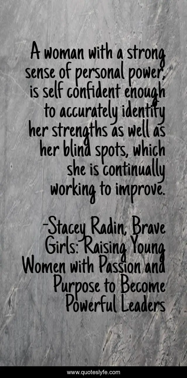 This page presents the quote "A woman with a strong sense of personal power, is self confident enough to accurately identify her strengths as well as her blind spots, which she is continually working to improve.". Author of this quote is Stacey Radin, Brave Girls: Raising Young Women with Passion and Purpose to Become Powerful Leaders. This quote is about parenting, empowerment, mentoring, feminism,.