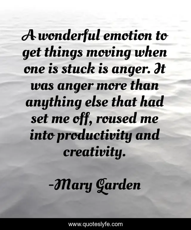 This page presents the quote "A wonderful emotion to get things moving when one is stuck is anger. It was anger more than anything else that had set me off, roused me into productivity and creativity.". Author of this quote is Mary Garden. This quote is about me, creativity, moving,.