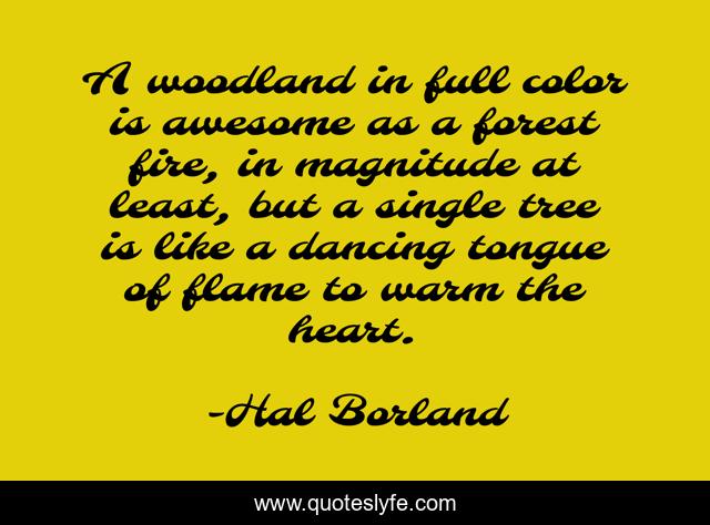 This page presents the quote "A woodland in full color is awesome as a forest fire, in magnitude at least, but a single tree is like a dancing tongue of flame to warm the heart.". Author of this quote is Hal Borland. This quote is about fire, heart, tree,.