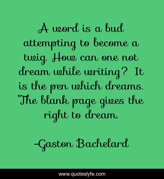 This page presents the quote "A word is a bud attempting to become a twig. How can one not dream while writing? It is the pen which dreams. The blank page gives the right to dream.". Author of this quote is Gaston Bachelard. This quote is about language, nature, phenomenology, writing, words, dreams,.