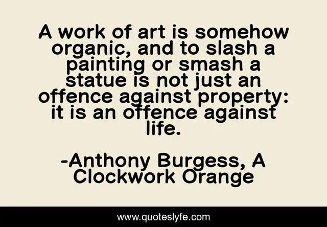 This page presents the quote "A work of art is somehow organic, and to slash a painting or smash a statue is not just an offence against property: it is an offence against life.". Author of this quote is Anthony Burgess, A Clockwork Orange. .
