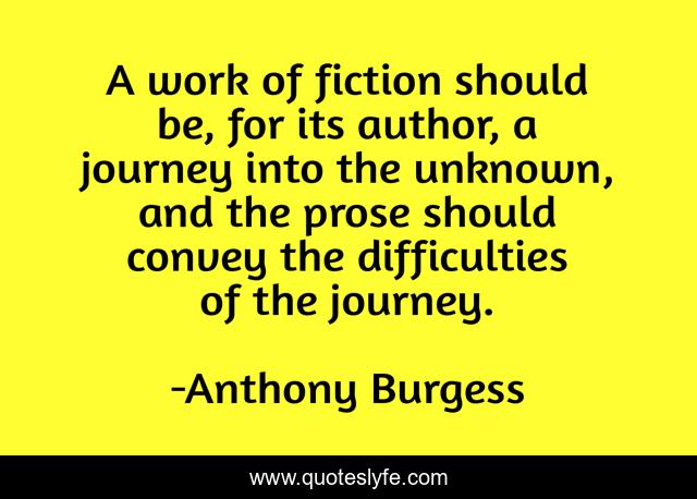 This page presents the quote "A work of fiction should be, for its author, a journey into the unknown, and the prose should convey the difficulties of the journey.". Author of this quote is Anthony Burgess. This quote is about creativity, artistic-endeavor,.
