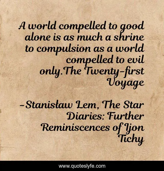 This page presents the quote "A world compelled to good alone is as much a shrine to compulsion as a world compelled to evil only.The Twenty-first Voyage". Author of this quote is Stanisław Lem, The Star Diaries: Further Reminiscences of Ijon Tichy. This quote is about good, evil,.