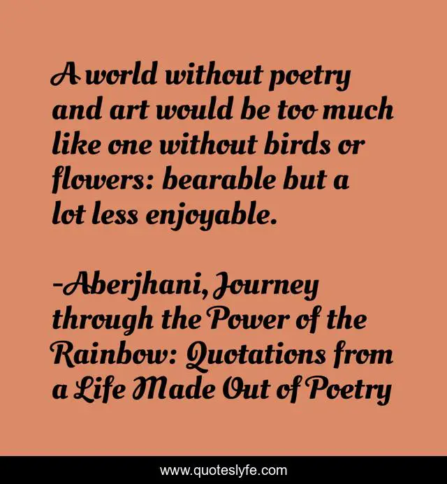 "Aberjhani, Journey through the Power of the Rainbow: Quotations from a Life Made Out of Poetry Quotes." Quoteslyfe.com, 2025. Sun. 07 Dec. 2025. <https://www.quoteslyfe.com/quote/A-world-without-poetry-and-art-would-8287>.