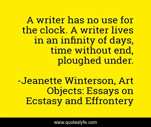This page presents the quote "A writer has no use for the clock. A writer lives in an infinity of days, time without end, ploughed under.". Author of this quote is Jeanette Winterson, Art Objects: Essays on Ecstasy and Effrontery. .