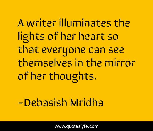This page presents the quote "A writer illuminates the lights of her heart so that everyone can see themselves in the mirror of her thoughts.". Author of this quote is Debasish Mridha. This quote is about lights-of-her-heart, mirror-of-thoughts, a-writer-illuminates, philosophy, debasish-mridha, quotes, being-a-writer, debasish-mridha-md, inspirational,.