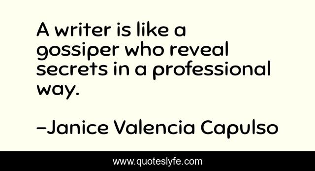 This page presents the quote "A writer is like a gossiper who reveal secrets in a professional way.". Author of this quote is Janice Valencia Capulso. This quote is about secrets, writer, writing, write, gossiper, gossip,.