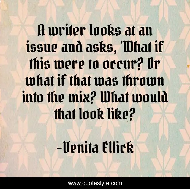 This page presents the quote "A writer looks at an issue and asks, 'What if this were to occur? Or what if that was thrown into the mix? What would that look like?". Author of this quote is Venita Ellick. This quote is about contemporary-women, fiction, qa, quotes, quotes-from-the-author, ellick, quotes-for-women, contemporary-fiction, venita-ellick,.