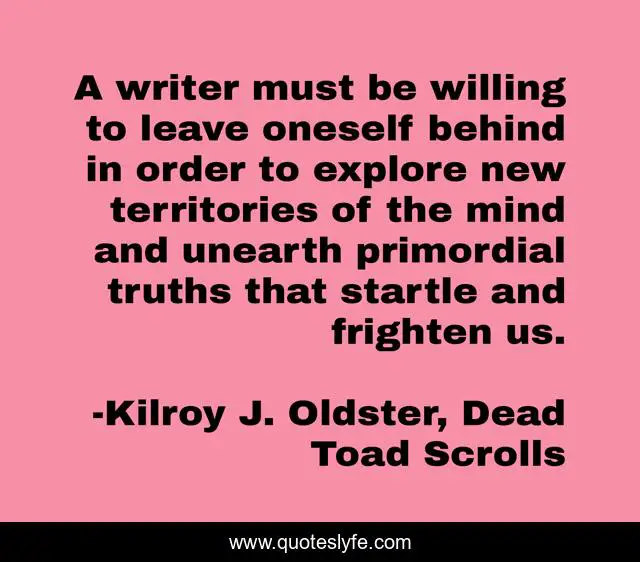 This page presents the quote "A writer must be willing to leave oneself behind in order to explore new territories of the mind and unearth primordial truths that startle and frighten us.". Author of this quote is Kilroy J. Oldster, Dead Toad Scrolls. This quote is about self-discovery, writing-process, writing,.