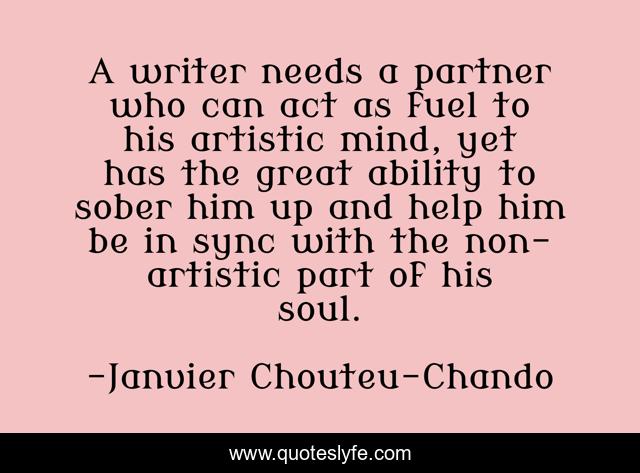 This page presents the quote "A writer needs a partner who can act as fuel to his artistic mind, yet has the great ability to sober him up and help him be in sync with the non-artistic part of his soul.". Author of this quote is Janvier Chouteu-Chando. This quote is about love, family, optimistic, confidence, humor, positive, romance, spirituality, enthusiasm,.