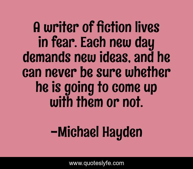 This page presents the quote "A writer of fiction lives in fear. Each new day demands new ideas, and he can never be sure whether he is going to come up with them or not.". Author of this quote is Michael Hayden. This quote is about ideas, day, new day,.