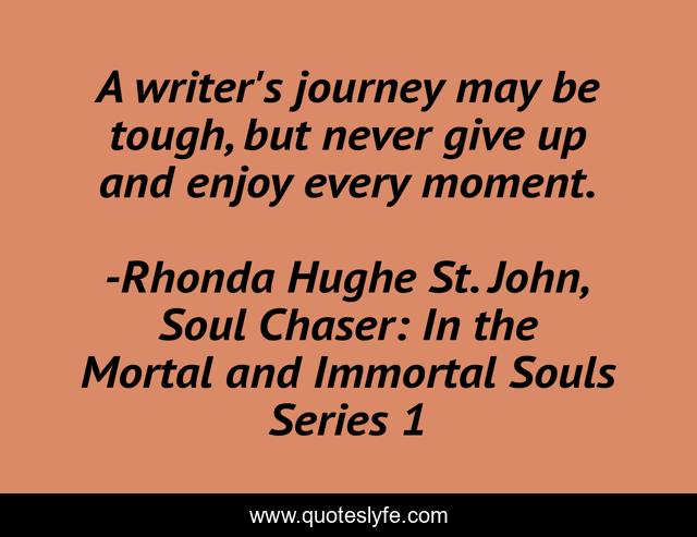 This page presents the quote "A writer's journey may be tough, but never give up and enjoy every moment.". Author of this quote is Rhonda Hughe St. John, Soul Chaser: In the Mortal and Immortal Souls Series 1. This quote is about romance, ghosts, angels, spiritual,.