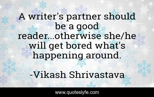This page presents the quote "A writer's partner should be a good reader...otherwise she/he will get bored what's happening around.". Author of this quote is Vikash Shrivastava. This quote is about partner, bored, writers, spouse, lover,.