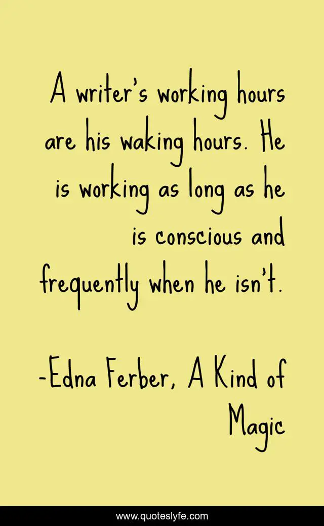 This page presents the quote "A writer's working hours are his waking hours. He is working as long as he is conscious and frequently when he isn't.". Author of this quote is Edna Ferber, A Kind of Magic. .