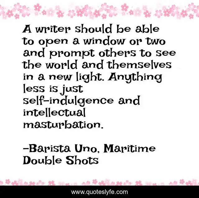 This page presents the quote "A writer should be able to open a window or two and prompt others to see the world and themselves in a new light. Anything less is just self–indulgence and intellectual masturbation.". Author of this quote is Barista Uno, Maritime Double Shots. This quote is about light, writer, intellectual, writing, window, masturbation,.