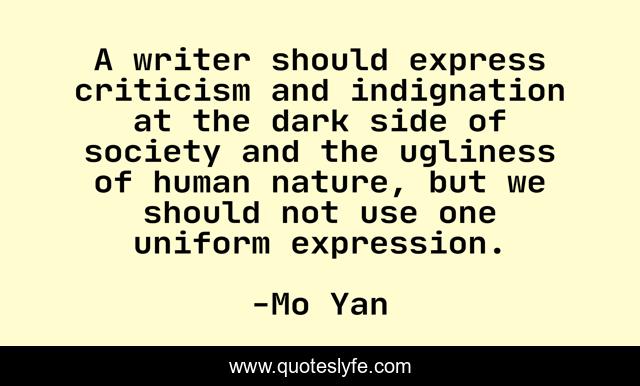 This page presents the quote "A writer should express criticism and indignation at the dark side of society and the ugliness of human nature, but we should not use one uniform expression.". Author of this quote is Mo Yan. This quote is about dark, human nature, nature,.