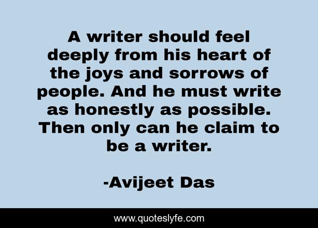 This page presents the quote "A writer should feel deeply from his heart of the joys and sorrows of people. And he must write as honestly as possible. Then only can he claim to be a writer.". Author of this quote is Avijeet Das. This quote is about heart, life, honesty, philosophy, feelings, sorrows, writers, writing, happiness,.