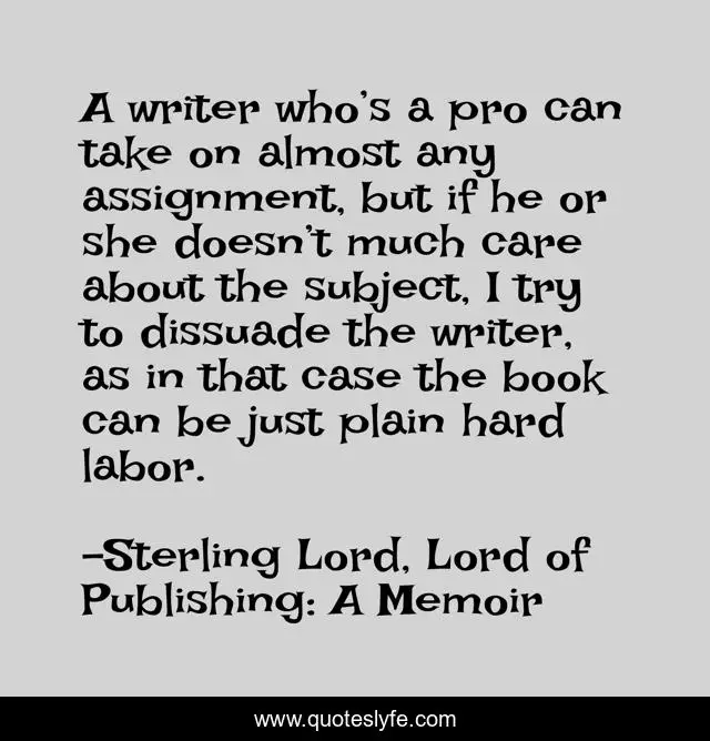 This page presents the quote "A writer who’s a pro can take on almost any assignment, but if he or she doesn’t much care about the subject, I try to dissuade the writer, as in that case the book can be just plain hard labor.". Author of this quote is Sterling Lord, Lord of Publishing: A Memoir. .