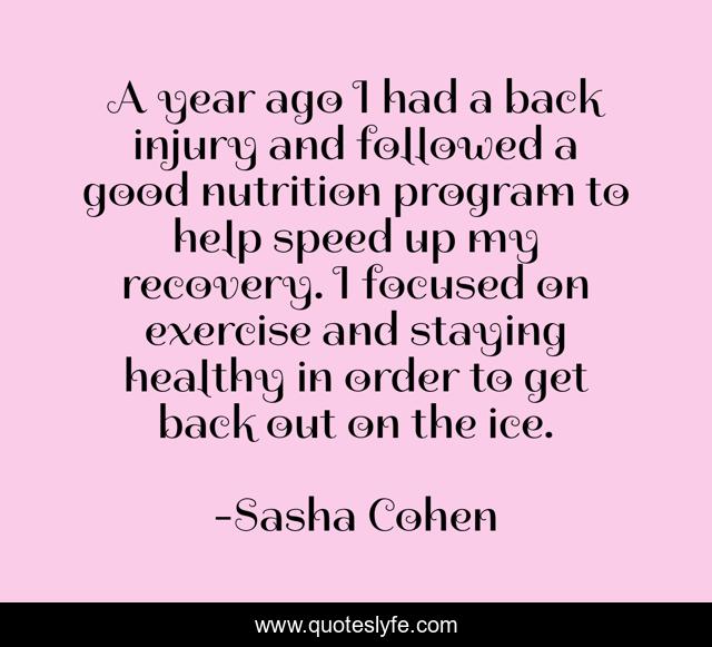 This page presents the quote "A year ago I had a back injury and followed a good nutrition program to help speed up my recovery. I focused on exercise and staying healthy in order to get back out on the ice.". Author of this quote is Sasha Cohen. This quote is about healthy, good, help,.