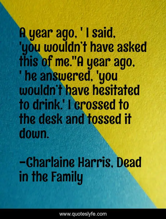 This page presents the quote "A year ago, ' I said, 'you wouldn’t have asked this of me.''A year ago, ' he answered, 'you wouldn’t have hesitated to drink.' I crossed to the desk and tossed it down.". Author of this quote is Charlaine Harris, Dead in the Family. This quote is about vampire, urban-fantasy, paranormal, sookie-stackhouse, werewolf,.