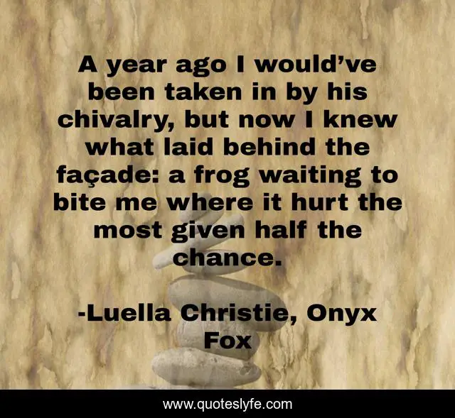 This page presents the quote "A year ago I would’ve been taken in by his chivalry, but now I knew what laid behind the façade: a frog waiting to bite me where it hurt the most given half the chance.". Author of this quote is Luella Christie, Onyx Fox. This quote is about humor, dating, love, relationship, affection,.